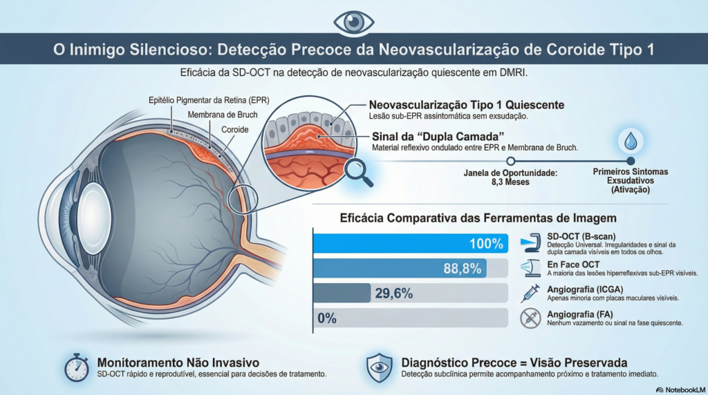 O resultado? O exame de OCT (B-scan) conseguiu detectar alterações específicas em 100% dos olhos que, meses depois, viriam a desenvolver a forma exsudativa da doença. Ou seja, o exame previu o problema antes dos sintomas aparecerem.